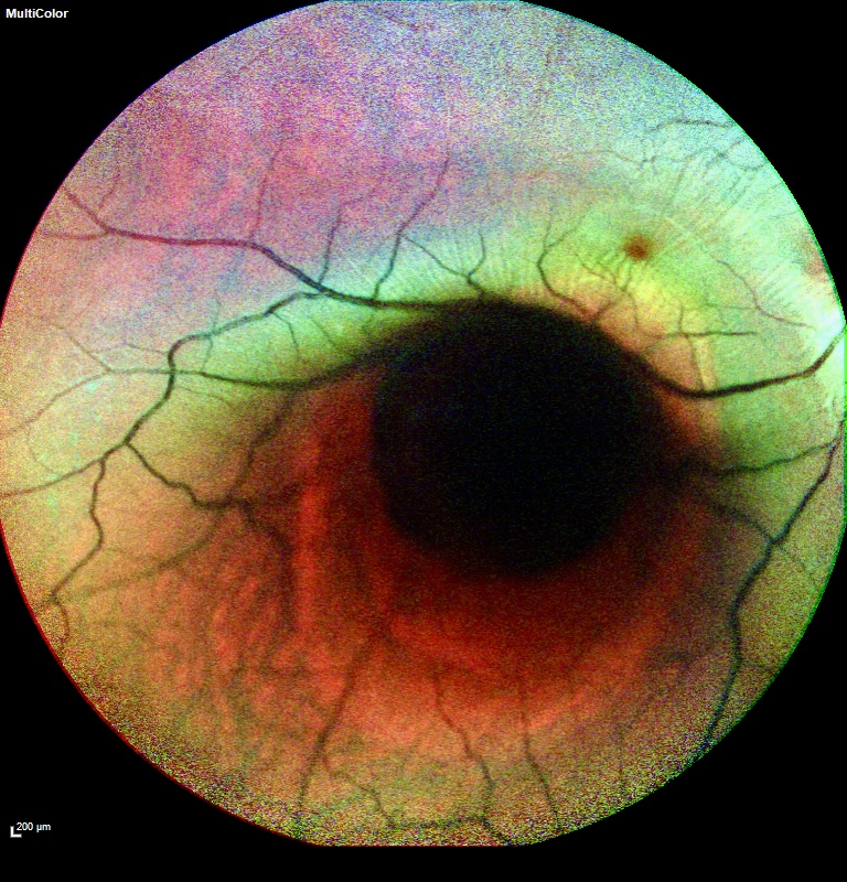 A 35 Years old male came with diminision of vision of Right Eye .On multicolor image we can appreciate large pigmented choroidal lesion with surrounding SRF which is reaching the fovea .With other investigation modality this patient confirmed to have Right Eye Choroidal Melanoma. This picture resembles peacocks feather and hence the name Retinal Plumage .