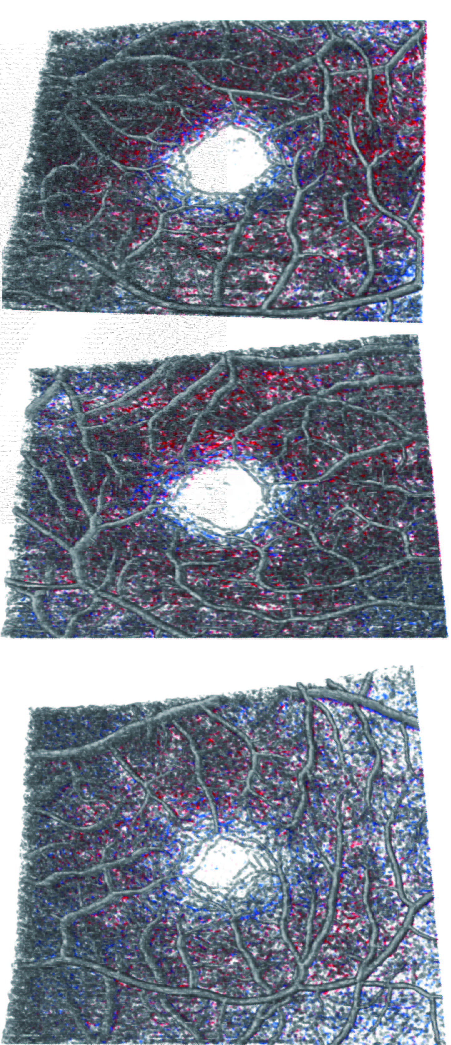with SVP in gray, ICP in blue, and DCP in red.Top row: amblyopic eye (OS);Middle row : fellow eye in anisometropic amblyopia patient (OD); Bottom row: healthy control (OS).Vessel density is highest in healthy controls, followed by fellow eye in anisometropic amblyopia patients, and lowest in amblyopic eyes.First, OCT and OCTA data are fed into a multitask convolutional neural network(CNN )to segment 3D RVs from volumetric OCT/OCTA data directly.Second, based on the 3D segmentation results, the vascular network is reconstructed in 3D, and a vessel skeleton map is extracted. Third,3D metrics are extracted to analyze the retinal vasculature quantitatively, including vessel volume density (VVD) ,which is calculated as the ratio between retinal vessels to the total retinal volume within the measurement region.